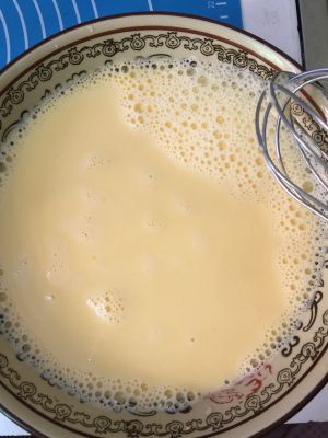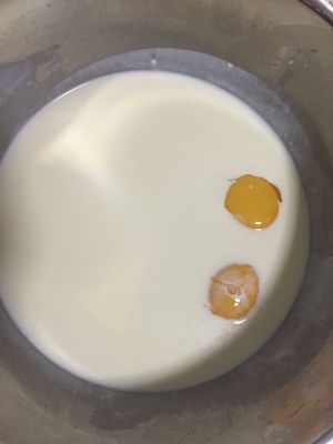 14、待奶锅中面粉牛奶融液冷却后加入蛋黄液,搅拌均匀;