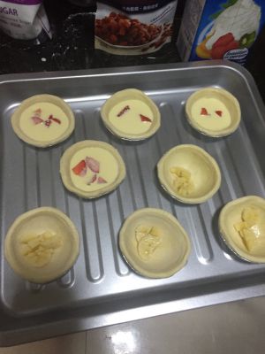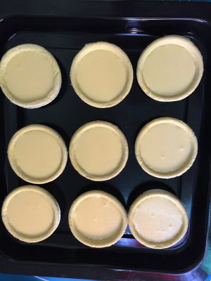 好啦!把挞水拿小勺倒入做好的挞模中,最多九分哦,太满会溢出的