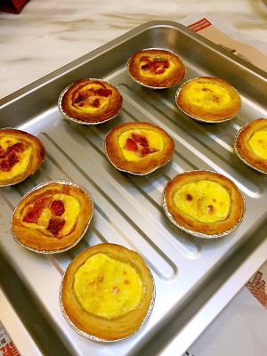 事先预热烤箱 190度。然后放入下层烤20分钟再放到上层烤2~3分钟 嫩嫩的蛋挞出锅