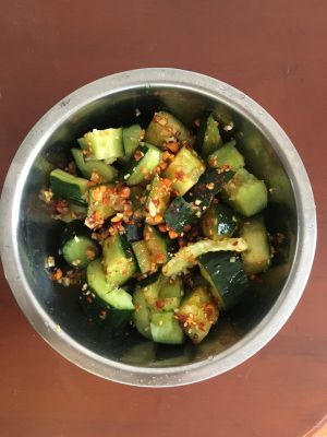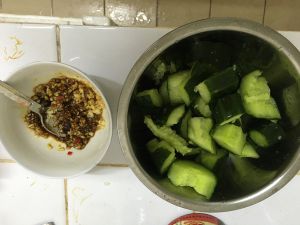 洗根黄瓜用刀拍散/想办法锤松,切成自己喜欢的块块扔一大碗里