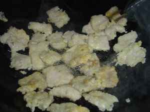 调至大火,将里脊肉再倒入锅中,过油复炸,捞出