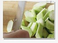 丝瓜去皮切滚刀片,如果家里没有刨子去皮的话,一般卖丝瓜的地方可以帮你去丝瓜皮的