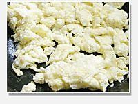 大火翻炒30秒后,就可以加待用的蛋花。一起混炒也不要太长时间,20-30秒也就可以出锅了