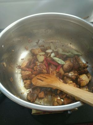 锅内放上花椒,干辣椒和冰糖,带冰糖融化放入鸡腿煸炒
