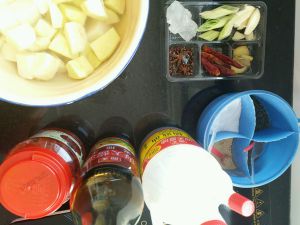 土豆洗净去皮切滚刀块 葱段和辣椒放一起 是配菜 姜片大蒜辣椒以及香料放一起 算配料