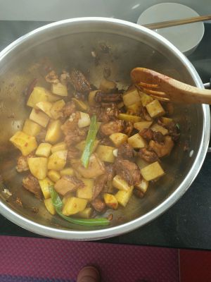 加入生抽和老抽,带鸡腿均匀上色后,加入切好的土豆,和洋葱翻炒