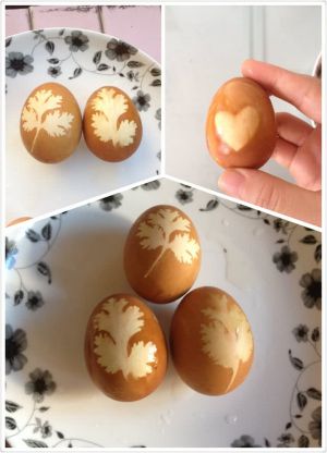 把喜欢的叶子湿水后贴在鸡蛋上。各种青菜的叶子都可以哦。这是香菜的叶子。