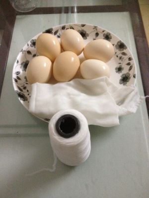 把鸡蛋,沙布洗干净,趁湿的时候就要包了,这样更好把叶子贴上去。线是做丝袜花用的弹力线,没有的话用缝衣服的白线也行。