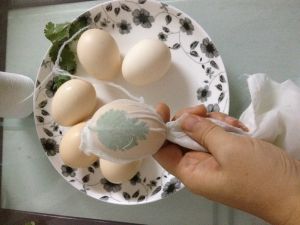 把鸡蛋包进沙布里,用线缠紧,记住把叶子紧紧的贴着鸡蛋哦,稍有空隙花纹就做不成了。