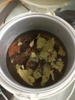 这时把卤料洗干净,放进锅里,加入适量白糖,盐,酱油和水。这里用的是电饭锅。