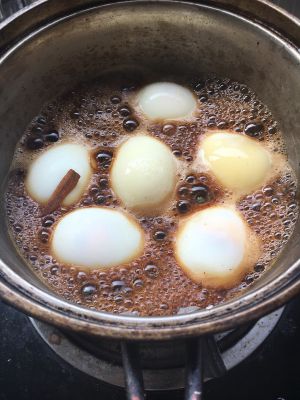 煮好的鸡蛋过凉水,拔透剥皮,洗干净,放入干净锅中,放入调料!(喜欢茶叶味的可放少许茶叶一起煮)放少许水,小火煮一会儿,直到鸡蛋变成茶色!