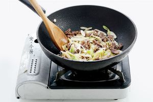 锅里放底油,烧热后,下腌好的羊肉片翻炒,变色后,加入葱丝,再翻炒,葱丝变软,一共炒个7-8分钟就行,视羊肉的厚度来决定炒的时间