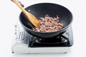 中火加热锅中的油,待烧至七成热时将腌制好的羊肉片放入,大火快速拨散,待羊肉表面变成熟色,再捞出沥干油分待用。