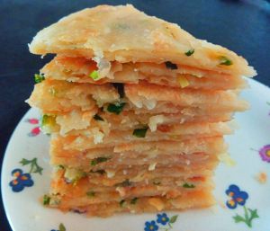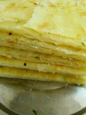 从一边卷起成长条状。结成几段再卷成图中一样的卷再擀成薄饼