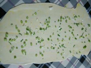 面团醒十分钟后擀成薄饼,刷上一层油后均匀撒上葱花和少许盐。