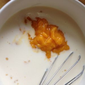 6、芒果奶昔加入吉利丁牛奶搅拌均匀,冰箱冷藏超过6小时;