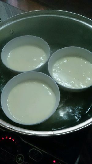 隔水加热约15分钟,中途可以揭锅看看凝固程度,防止炖老了。