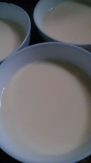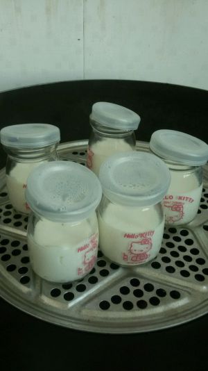 纯牛奶(我用的是 伊利的全脂纯奶),两份的量,250ML的盒装奶两盒,牛奶倒蒸碗隔蒸,为的是加热。 注明一下,牛奶也可放倒入奶锅里加热再倒到蒸碗里,奶锅不要有油,加热时注意不要煮沸,煮沸了就结不成咯。