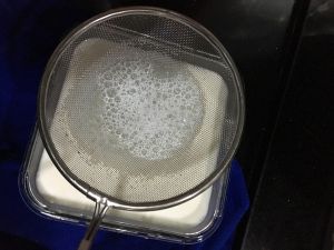 把倒好在两个小碗的蛋清牛奶混合液筛网滤一两遍