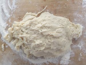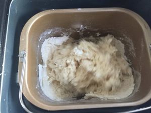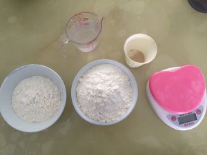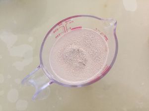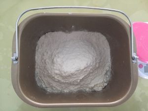 将搅拌好的酵母水倒入桶中,再倒入面粉