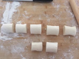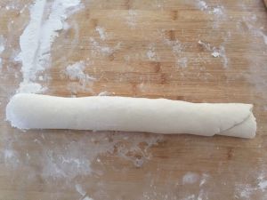 馒头切成一厘米左右的片。碗里打两个鸡蛋,搅匀,放少许盐,葱花。