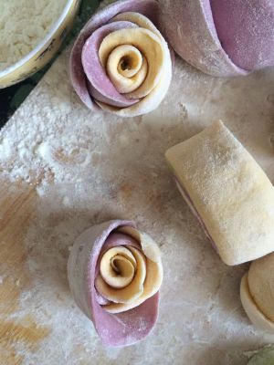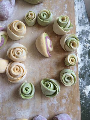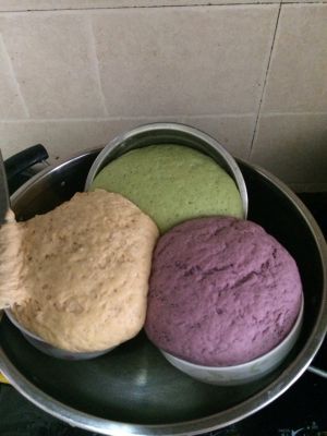 菠菜榨汁,胡萝卜榨汁,和面粉一起活好。紫薯在锅里藤熟活面。