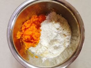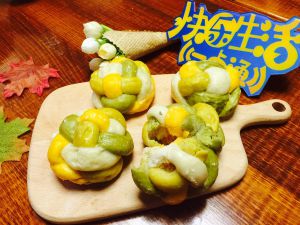 黄色面团,面粉150g:南瓜蒸熟以后碾成泥,2g酵母粉加温水溶解,倒入面粉,然后加入南瓜泥,按面团的软硬度决定放南瓜泥的多少,和成团