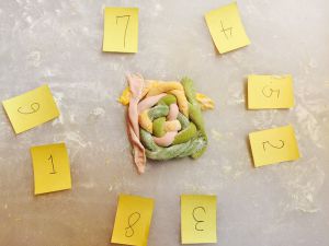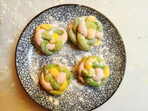 然后用3分之1的黄色面团加上3分之一的深绿色面团和成淡绿色的面团,四个颜色的面团都揉好以后盖上保鲜膜醒发2个小时,夏天室温就可以,冬天可以放在暖气边上