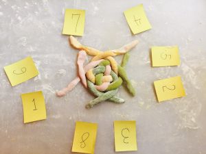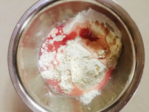 粉色面团,面粉100g:2g的酵母用一点点温水和开至完全溶解,倒进面粉里,再慢慢加入苋菜水,揉和成团