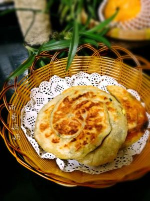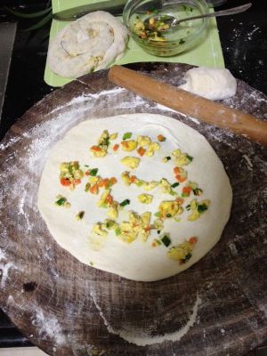 然后擀成饼状,上面放一层油、盐、葱花、五香粉,可放入适量面粉,会有分层的效果!