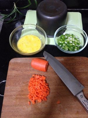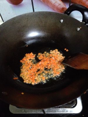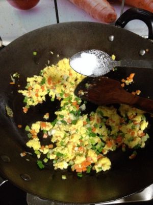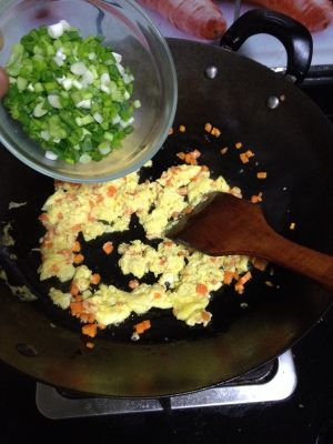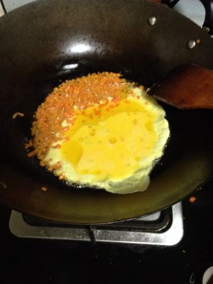 入鸡蛋液,煎至稍成型,再打碎成鸡蛋碎丁,这样口感好一些~