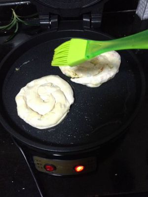 由于是晚上制作的,也没有仔细弄造型,就盘起来而已。电饼档刷少许油,预热后放入面饼,饼面刷油少许~