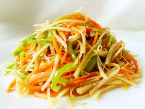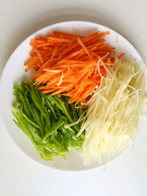 最后,热锅放油,油热后调到中火放入肉丝姜丝,蒜片,葱花爆香,再放入土豆丝炒至八分熟放入胡萝卜丝放入调料煸炒最后出锅