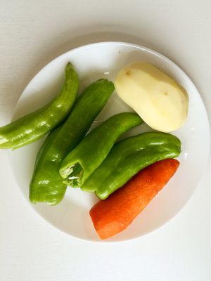 土豆去皮清洗干净,尖椒和胡萝卜清洗干净备用。