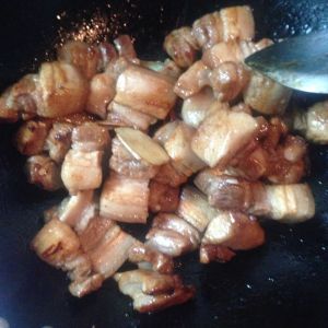 生姜和葱段煸香后倒入五花肉,煸炒至出油,表面微黄!