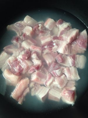 五花肉切块,先抄一遍水,然后捞出洗干净,放一边