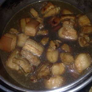 加开水没过食材,大火煮开改中火15分钟后改小火40分钟,到最后汁水不多时,放入一点冰糖,最后加入鸡精就大功告成了。