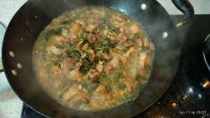 水煮掉三分之二时'土豆去皮切滚刀块加盐鸡精下锅转中火一块煮'最后大火收汁即可