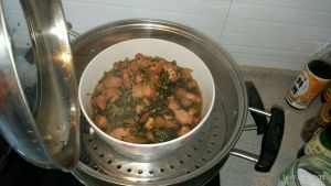 加入雪菜后烧至收汤,这时已经有很多油了,加鸡精。不过还没好,最重要的一步到了。。。将盛入碗中的成品放入蒸锅文火蒸上一个小时,中途不要揭盖。