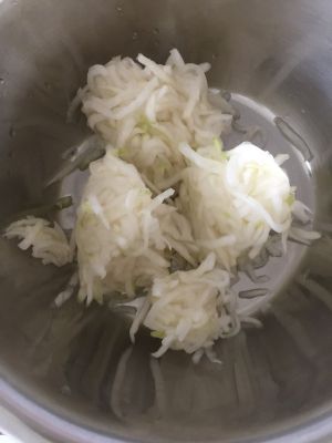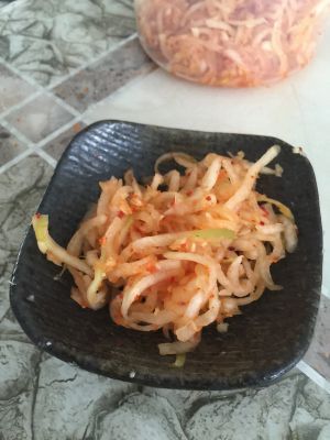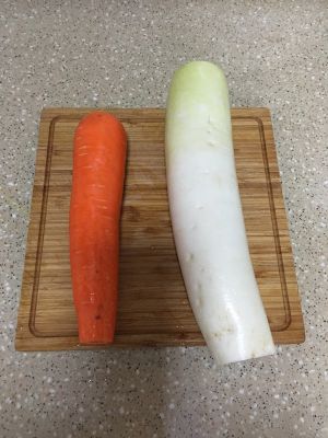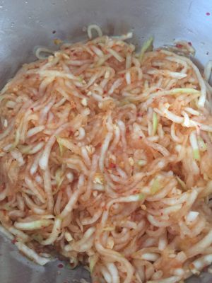 白萝卜或红萝卜都可以,我用了一个白萝卜比较脆,用工具擦成丝,两勺盐腌软,盐量可以改,根据自己口味