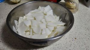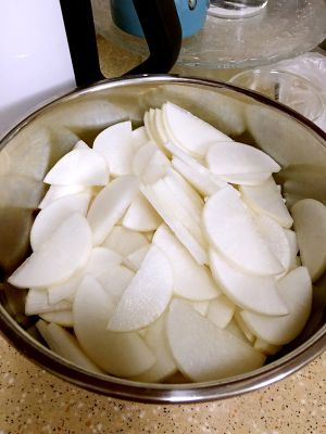 萝卜洗净切薄片装入碗中,放入1勺盐搅拌均匀放一边,待其出水;