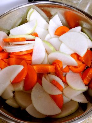 腌制后,汤倒出。冰糖弄碎,剩余的半勺盐和所有材料一起放入,拌匀。颜色不要太深。