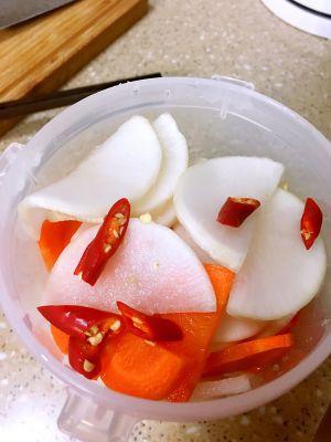 拔萝卜放进密封盒,放入切好的辣椒,倒入白醋,在撒入白糖,密封好,来回轻晃几下,大功告成啦✌️