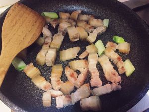 锅中热油,小火将肉和葱段小火煎至金黄色。