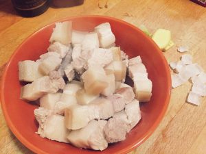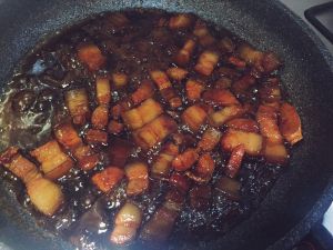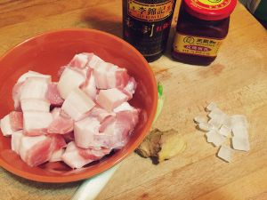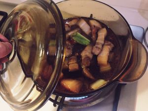 热锅冷油,下入五花肉煸炒,倒入调味料,一碗清水,关小火焖煮60分钟左右