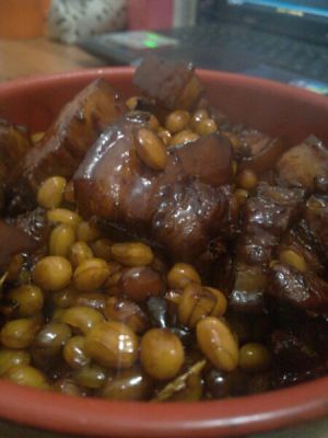 热锅热油下姜片花椒八角炒香 倒入焯好的五花肉翻炒 一会 表面微黄(不要炒太久 瘦肉会柴~)倒入开水 有条件加骨汤 加泡好的黄豆(泡一整夜黄豆忘交代了 呵呵) 水没黄豆和肉就可以 然后加黄酒至少五勺 酌量添加 加入酱油 糖 盐 沸腾后大火三分钟