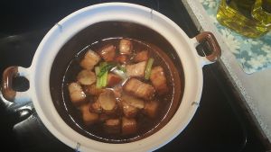 然后转入砂锅中,加入红烧酱油,然后加水刚没过肉块