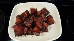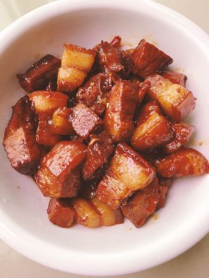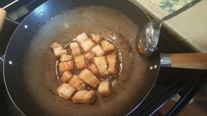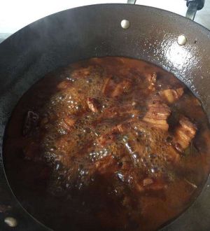倒入淹没肉块的开水,加一勺老抽、适量盐、黄酒、味极鲜、腐乳汁,小火慢炖45分钟,然后大火收汁,最后加鸡精出锅。