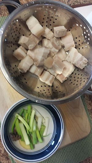 带皮五花肉整块过沸水后过下凉水切大块。然后把肉块再过一次沸水煮至周围变白后过凉水备用