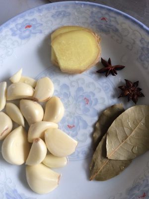 准备材料,姜两三片,八角两个,香叶三片,蒜放多点